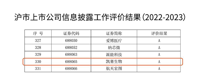 2023年10月20日,上海证券交易所发布沪市科创板上市公司2022-2023年度信息披露工作评价结果,凯赛生物因在信息披露质量、投资者关系管理等各方面的优异表现,荣获最高评级“A”级评价。